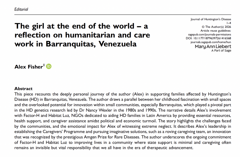 Alex Fisher is an occupational therapist who has worked with HD patients most of her career, first in the UK and now working side by side with the Factor-H and Habitat LUZ team in Venezuela, helping the most destitute individuals afflicted with HD in Barranquitas, Venezuela.